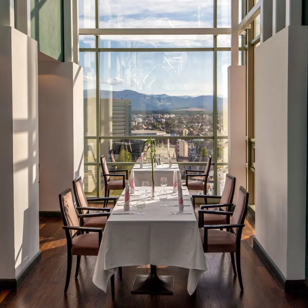 Restaurantul are o zonă în care puteți organiza cine private într-o ambianță intimă. Pereții de sticlă și cupola din restaurant vă aduc mai aproape de nori, în timp ce bucătăria internațională și combinația perfectă de arome vă încântă simțurile.