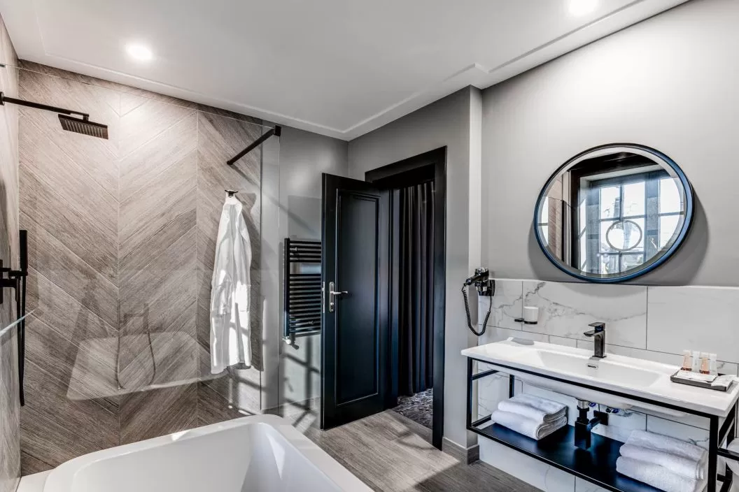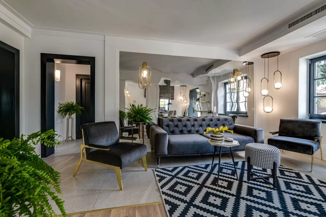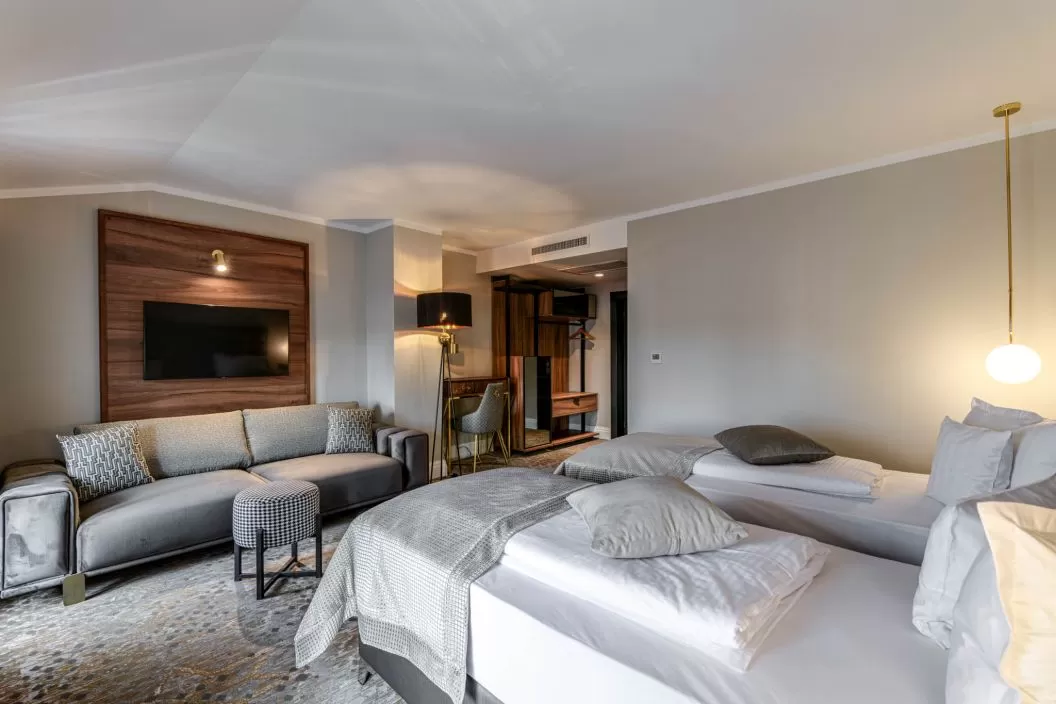 Camera dubla Deluxe are suprafata 35 m2, capacitate 1-3 persoane, 1 pat King si canapea, baie proprie cu duș, uscător de păr, halate de baie, articole de toaletă, aer condiționat, TV cablu cu ecran plat, Internet, pereți izolați fonic, minibar, zonă de relaxare, vedere la o stradă liniștită.