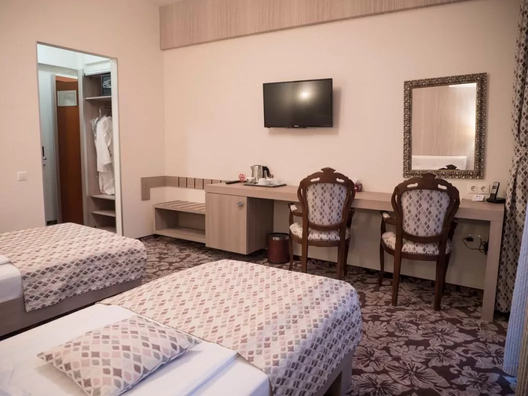 Camerele duble au aer condiționat și încălzire cu control individual, TV LCD cablu, telefon, baie proprie, uscător de păr, Internet wireless, aparat de cafea si ceai, ceas deșteptător cu radio, mini-bar.