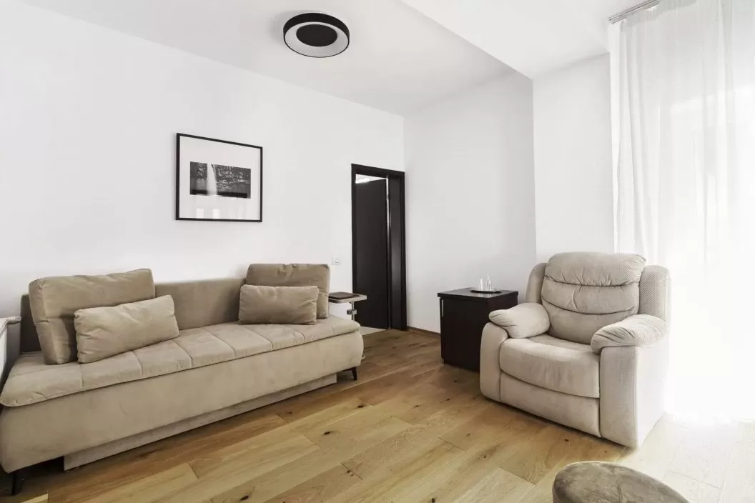 Apartament: dormitor cu pat matrimonial și living cu canapea extensibilă, balcon.