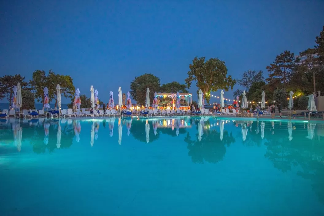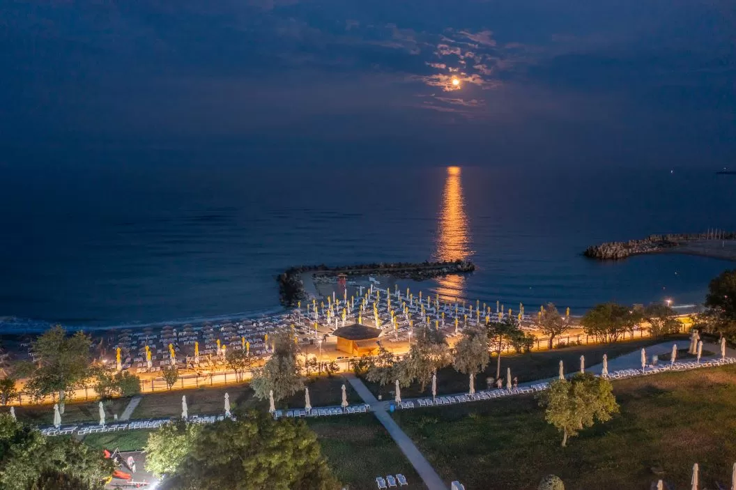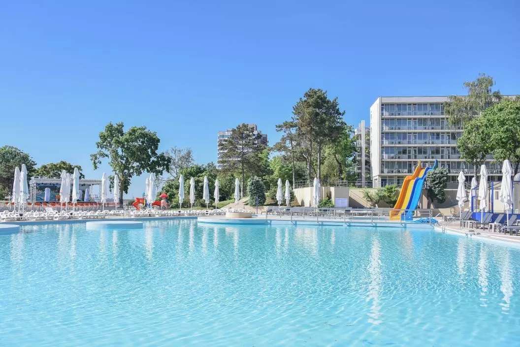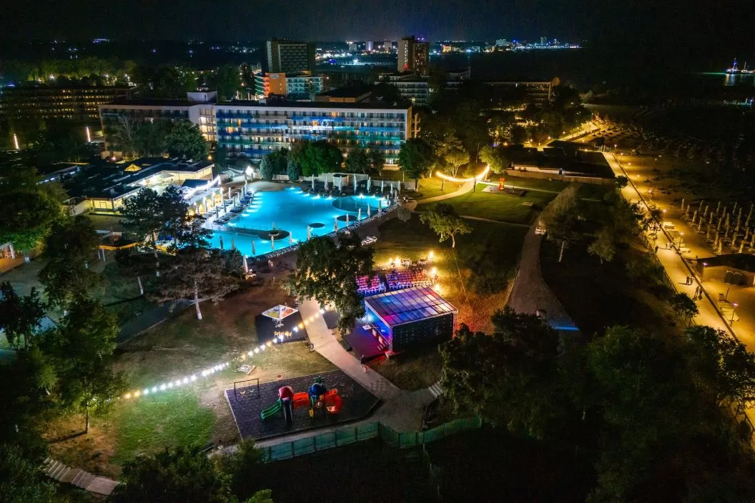 Cele 2 hoteluri dispun de o curte comuna cu o suprafata de peste 10.000 mp, o piscină generoasă de peste 1.500 mp, precum și de o plajă privată de peste 5.000 mp.