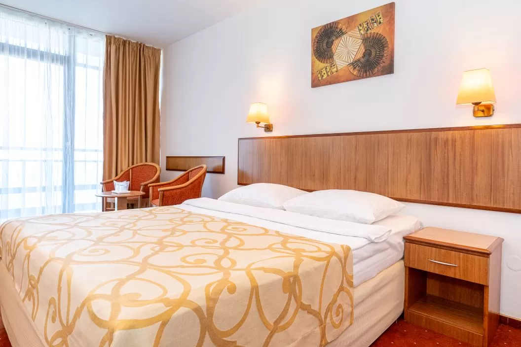 Camera Dubla Matrimoniala in Hotel Cleopatra: suprafata de 15 mp, un pat matrimonial (160/200 cm). Capacitate maxima cazare: 2 adulti și 1 copil care va dormi in pat cu adultii, nu sunt disponibile paturi suplimentare.