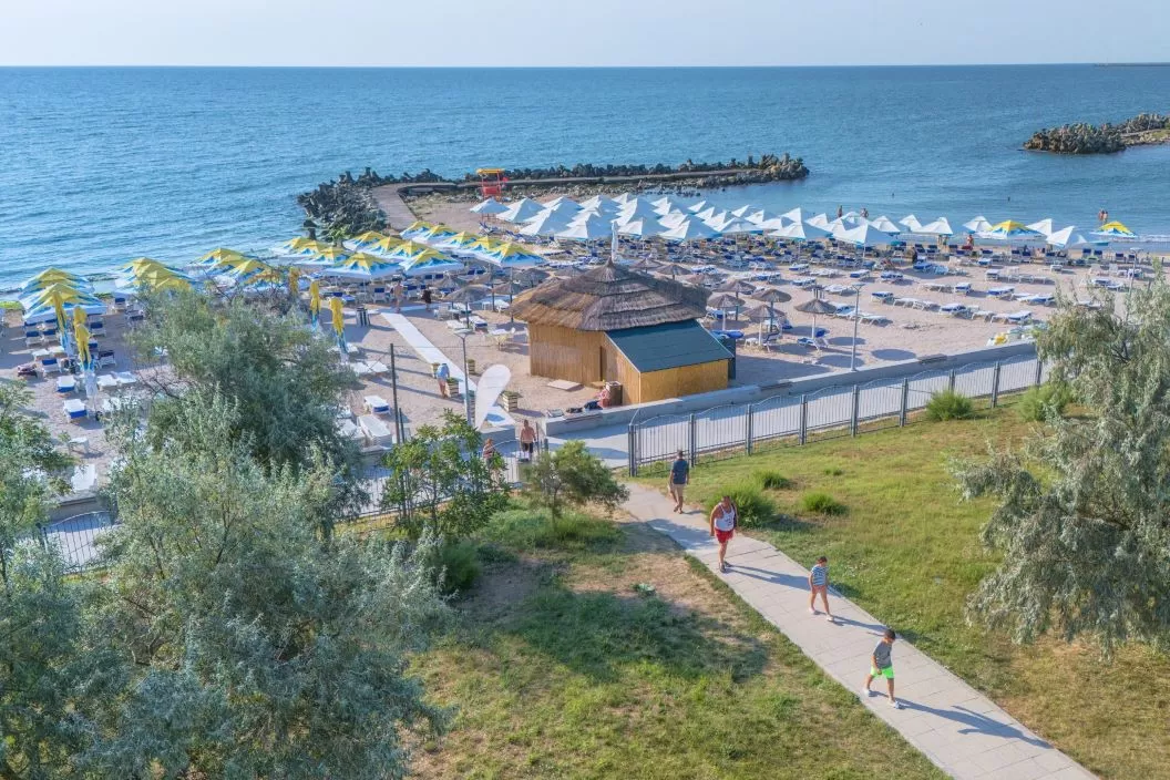 Plaja privată este situată la aproximativ 50 de metri și dispune de beach bar cu bauturi incluse in pachetul achizitionat.