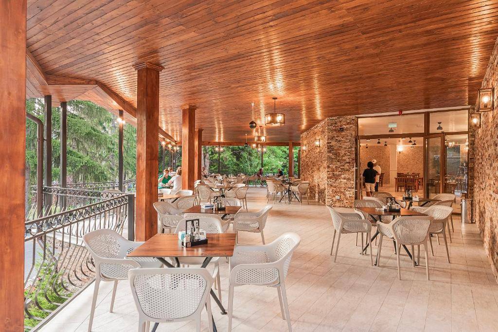 Restaurantul hotelului dispune de 158 locuri si de o terasa principala in imediata vecinatate a raului Olanesti si a celor doua parcuri, cu o capacitate de 50 locuri, si o terasa de dimensiuni mai mici cu vedere directa spre raul Olanesti cu o capacitate de 12 locuri.