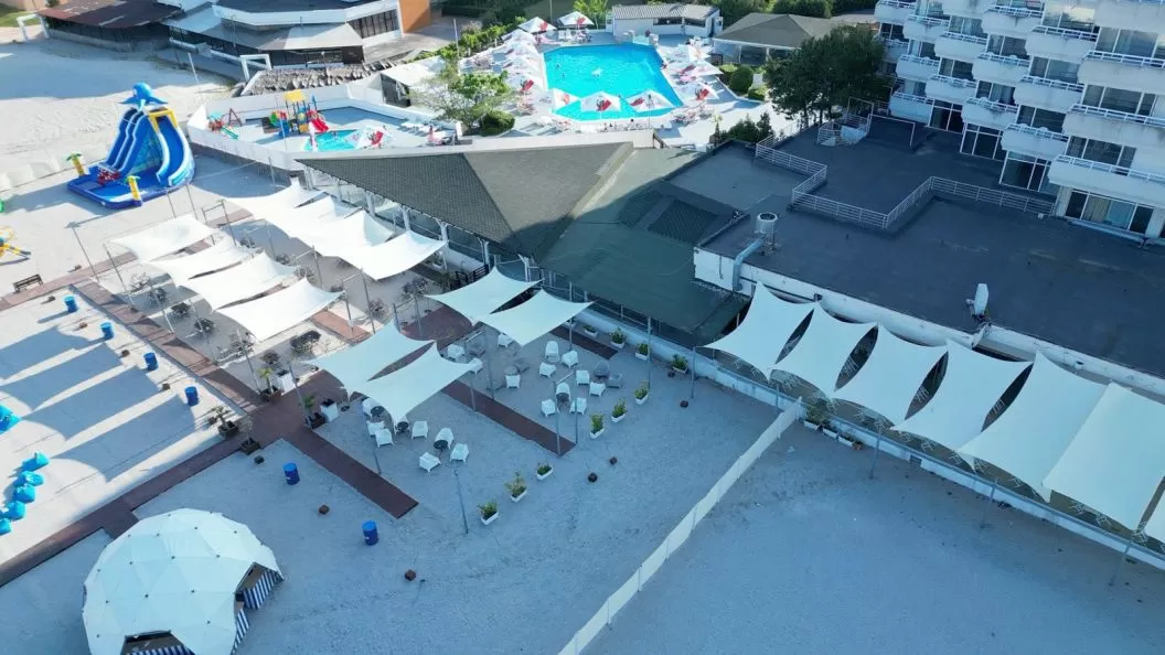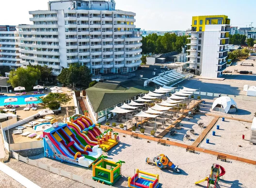 Facilitati hotel: restaurant elegant cu 250 de locuri, terasă 150 de locuri, piscină exterioara pentru adulti, piscină exteriora pentru copii, şezlonguri şi umbrele de soare la piscina si pe plaja privata, teren de joacă pentru copii, loc de joacă lângă piscină.