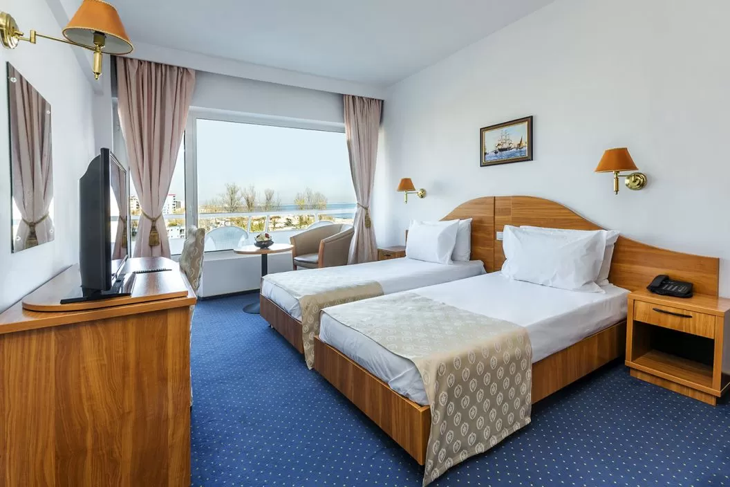 Camera dubla cu vedere la mare: suprafata 30 mp, balcon 5 mp cu deschidere spre mare, capacitate maxima 2 adulti si 2 copii.
