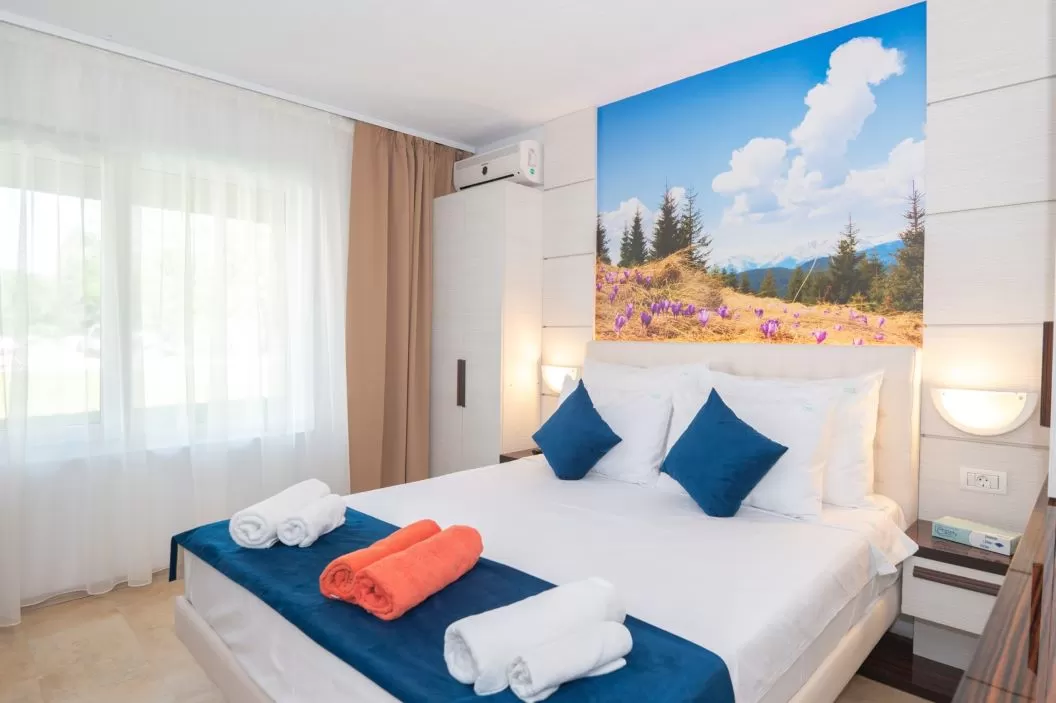 Apartament: suprafata 26 mp, dormitor cu pat matrimonial (160/190 sau 160/200 cm) si living cu canapea extensibila, 1 baie, capacitate maxima cazare 2 adulti si 1 copil sau 3 adulti.