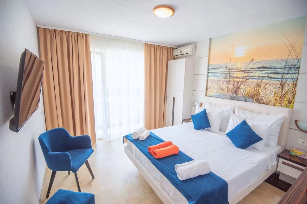 Dotări camere in Hotel Irina: sistem de acces in camera pe baza de cartela sau cod de acces, aer conditionat, TV LCD, baie cu dus, balcon pentru camerele situate la etaj.