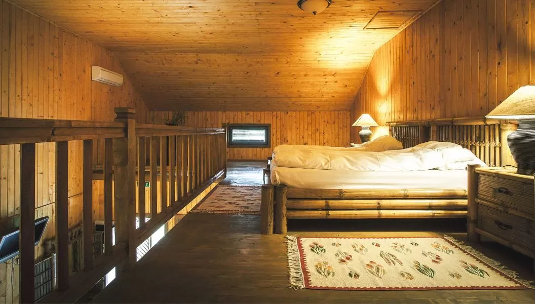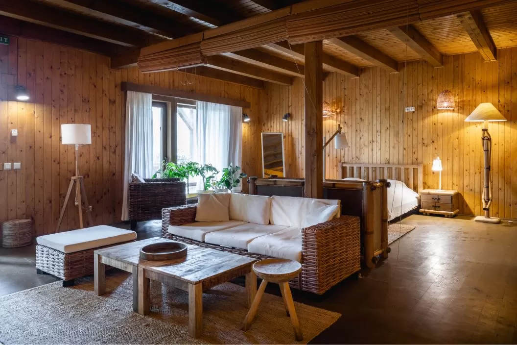Apartamentul cu 2 camere este format dintr-un living, la parter (cu grup sanitar, terasă) şi un dormitor (cu 1 pat matrimonial sau 2 twin), la etaj, legătura făcându-se printr-o scară interioară de lemn, care continuă cu balustradă. Livingul din apartamente este dotat cu 1 pat single (90*200 cm), măsuţă şi 2 fotolii de ratan. Acestea nu sunt extensibile, dar spaţiul permite instalarea unui alt pat suplimentar (pliant; la cerere, în funcţie de disponibilitate; contra cost).