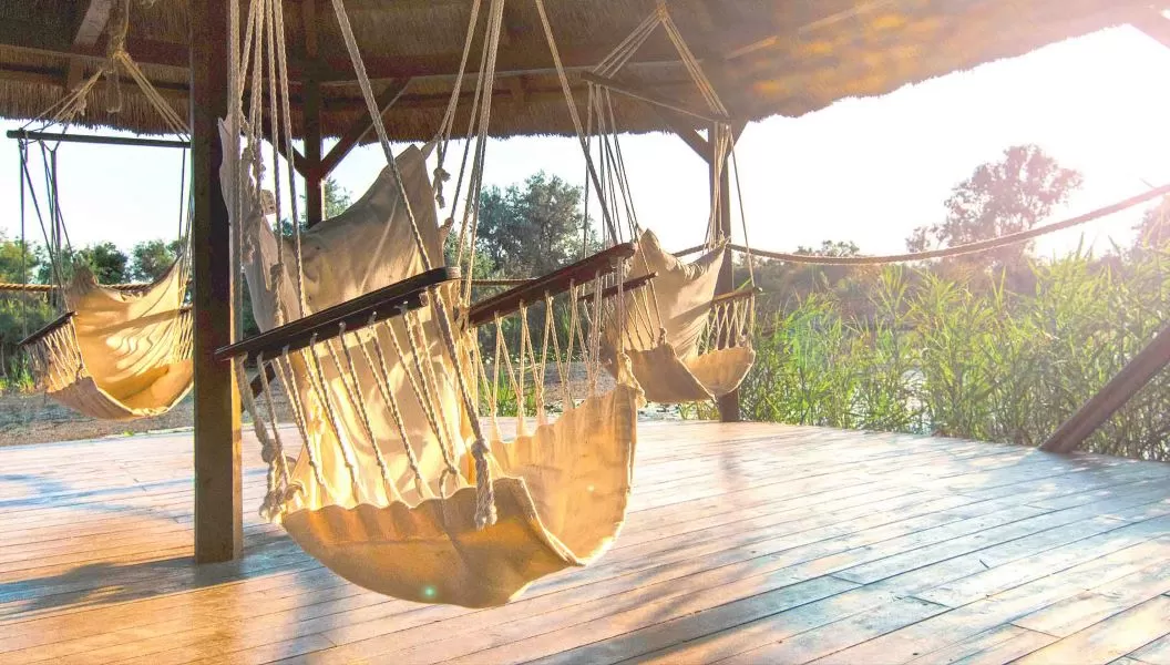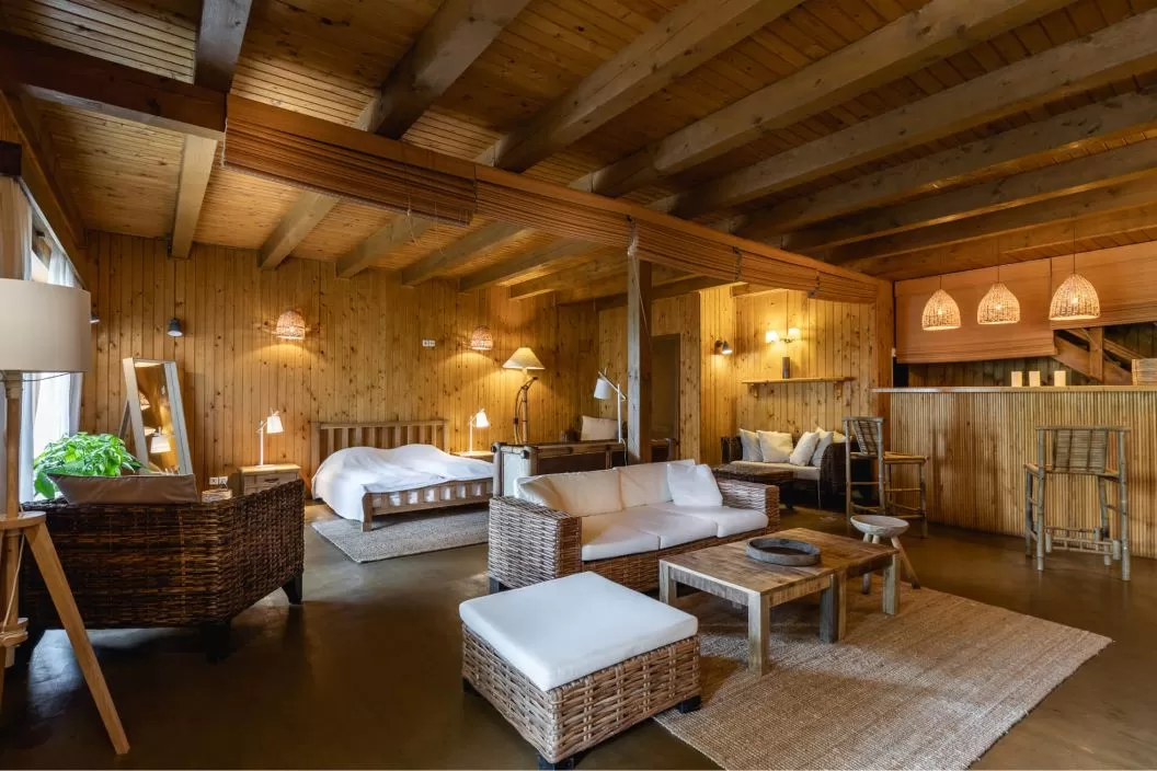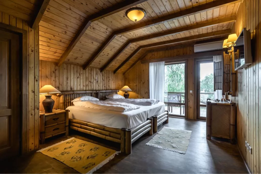Bungalourile acoperite cu stuf, 9 la număr, sunt presărate printre sălcii plângătoare și printre cântecele rațelor sălbatice. Fiecare bungalou adăpostește aceste apartamente cu 2 camere, cu living luminos și toaletă la parter și dormitor la mansardă.