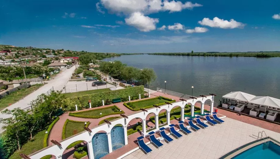 Facilitati: restaurant, bar, terasa acoperita pe faleza Dunarii, terasa cu barbeque, piscina exterioara cu sectiune pentru copii, sezlonguri si umbrele pentru plaja, teren de sport, teren de joaca pentru copii, parc cu alei si bancute pentru relaxare, lift, room service, internet wireless, organizare excursii cu ambarcatiuni in Delta Dunarii, ponton de acostare pentru cei cu ambarcatiuni proprii, sala conferinte, parcare pazita si supravegheata video.