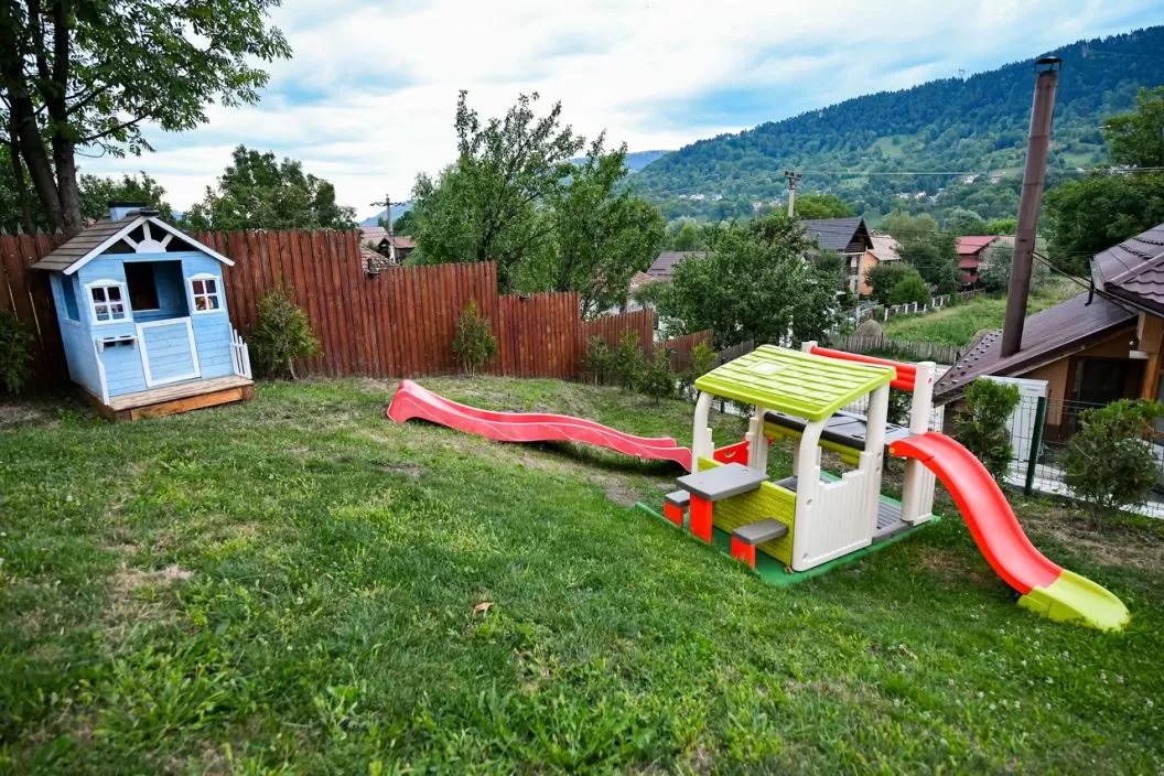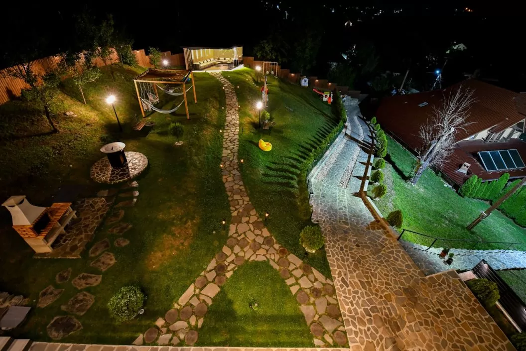 Grădina generoasă vă întâmpină cu o priveliște superbă, fiind dispusă pe trei niveluri și amenajată în stil modern: bâncuțe și măsuțe în stil vintage, leagăne și hamace, zonă de grătar și loc de joacă pentru copii.