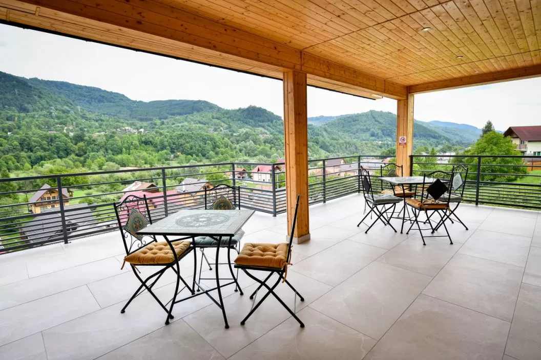 Terasa exterioară este dotata cu mese, scaune și priveliște la înălțime are 70 mp, de aici puteți admira peisajul ca de poveste care atât vara cât și iarna.